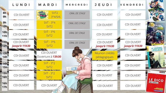 Par BETTY DREVET, publié le vendredi 14 novembre 2025 11:24 - Mis à jour le vendredi 14 novembre 2025 11:24📅 Retrouvez le planning du CDI du lundi 17 au vendredi 21 novembre ! 📚 Bonne chance aux 3èmes pour l'oral de stage mercredi ! -