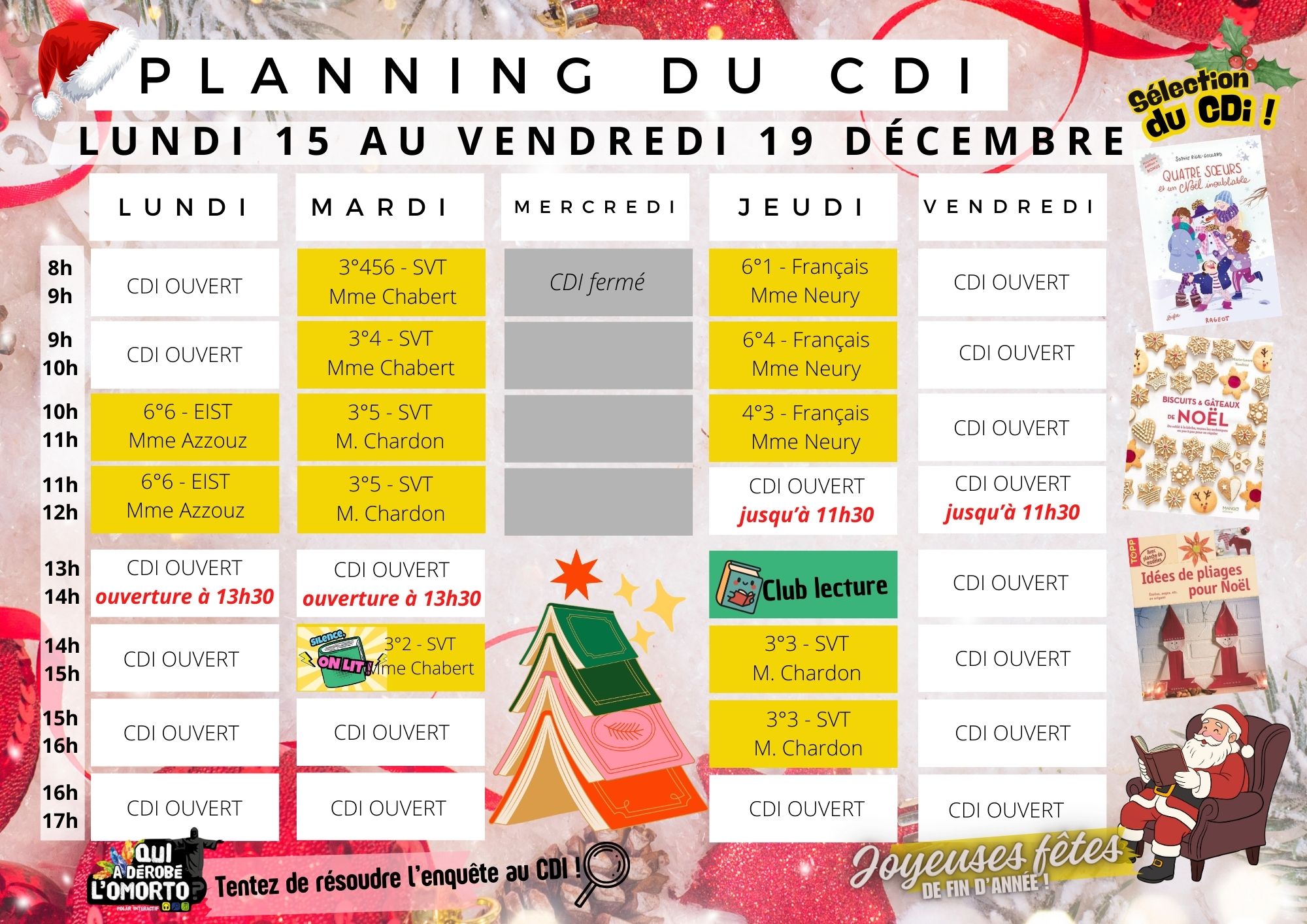 ❄📅 ⛄Retrouvez le planning du CDI du lundi 15 au vendredi 19 décembre ! 📚🎅🏻🎁❄