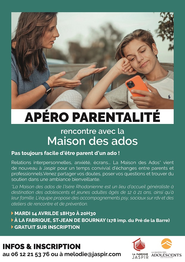 La troisième rencontre de Jaspir avec la Maison des Ados de l'Isère rhodanienne, autour de la parentalité d'adolescents, se déroulera le mardi 14 avril.