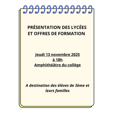 Par Roxane Tabaret, publié le vendredi 7 novembre 2025 09:45 - Mis à jour le vendredi 7 novembre 2025 09:49Jeudi 13 novembre 2025 à 18h pour les élèves de 3ème et leurs familles -