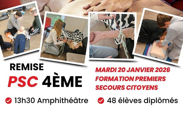 Les élèves de 4èmes ayant réussis leur formation PSC ( Premier Secours Citoyen) pourront récupérer leur diplôme mardi 20 janvier de 13h à 13h30 dans l'Amphithéâtre du Collège.